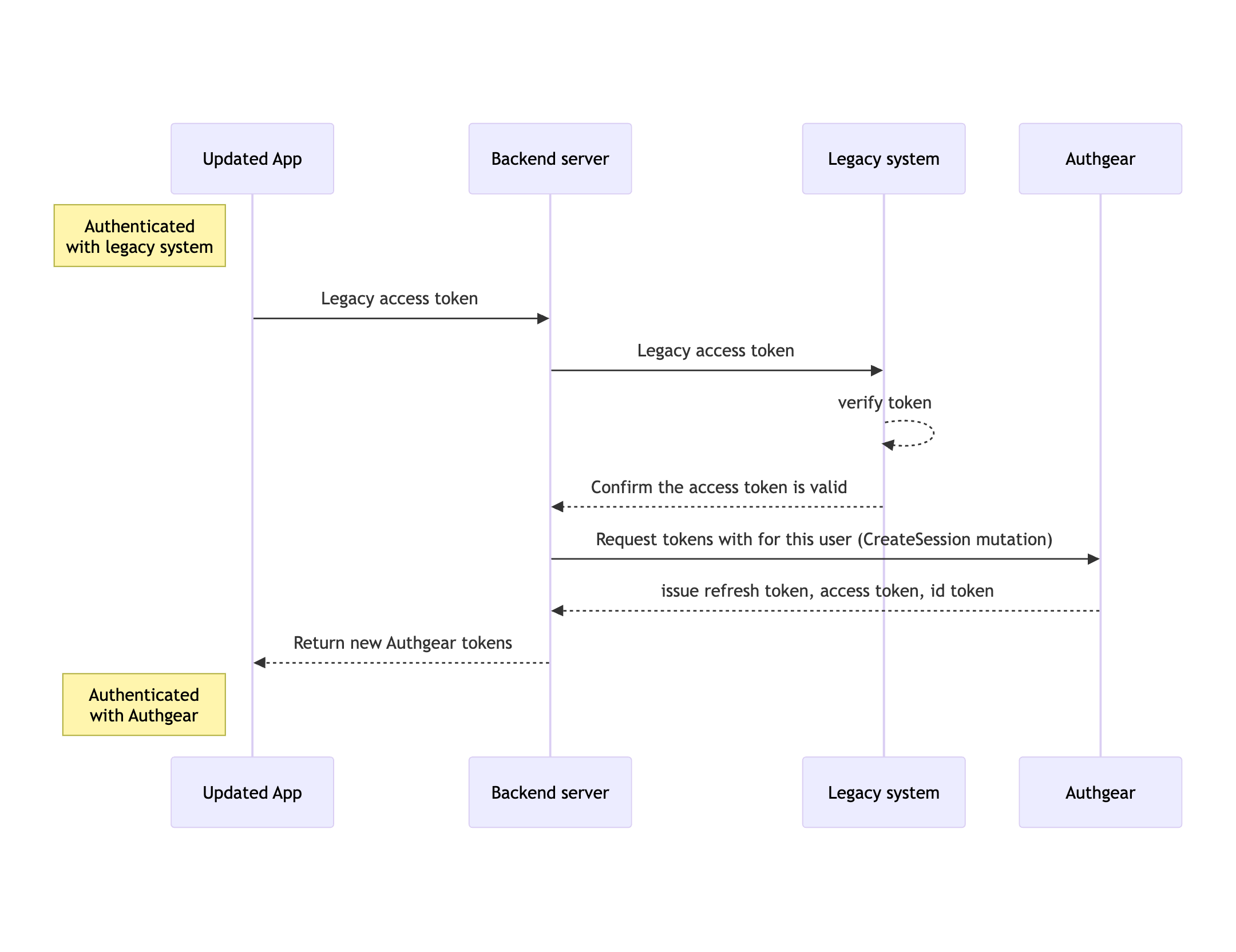 To exchange a valid access token from your old system, implement a migration endpoint that calls the **CreateSession** mutation of Authgear's Admin API.