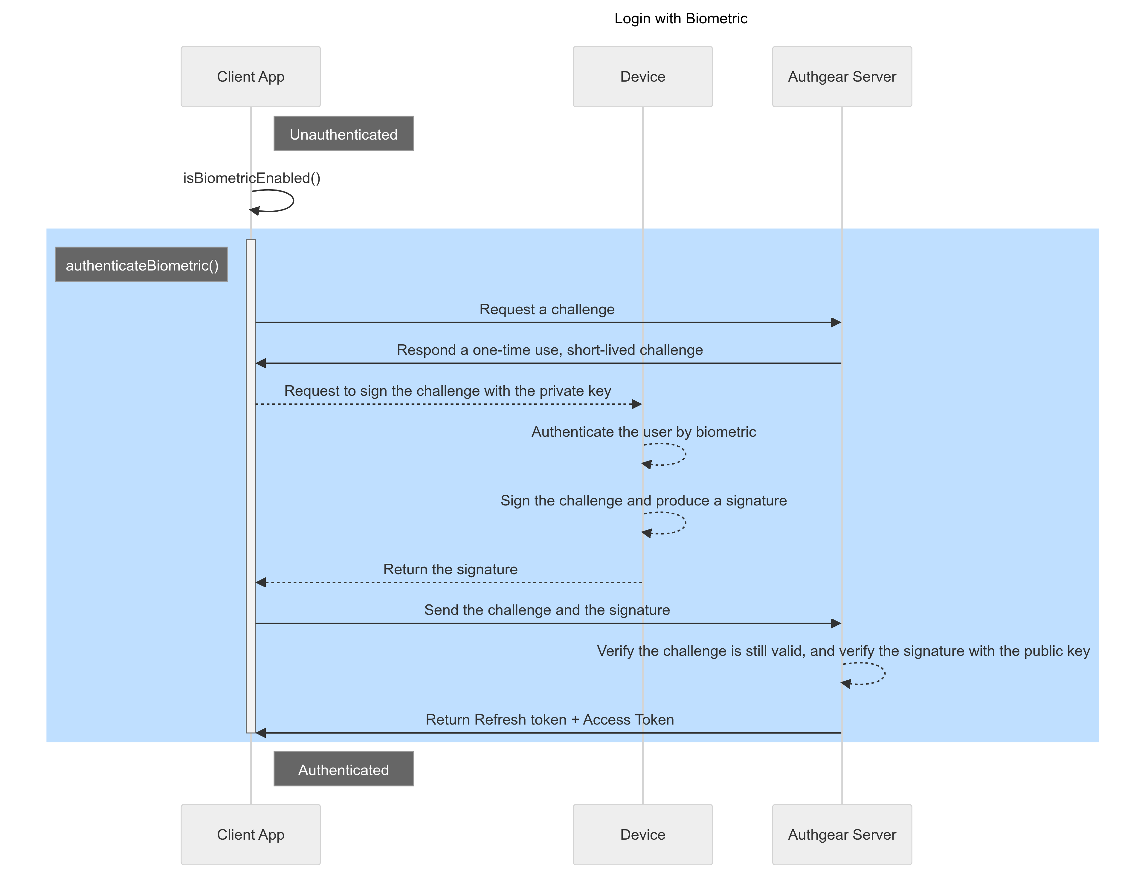 With biometric login already enabled for the user, the next time they need to log in they can initiate a biometric authentication flow which will follow the sequence shown in Fig 2.0 above. Once the biometric login is successful, Authgear server will return an access token and a refresh token. The client application can then use the access token to make authenticated requests.