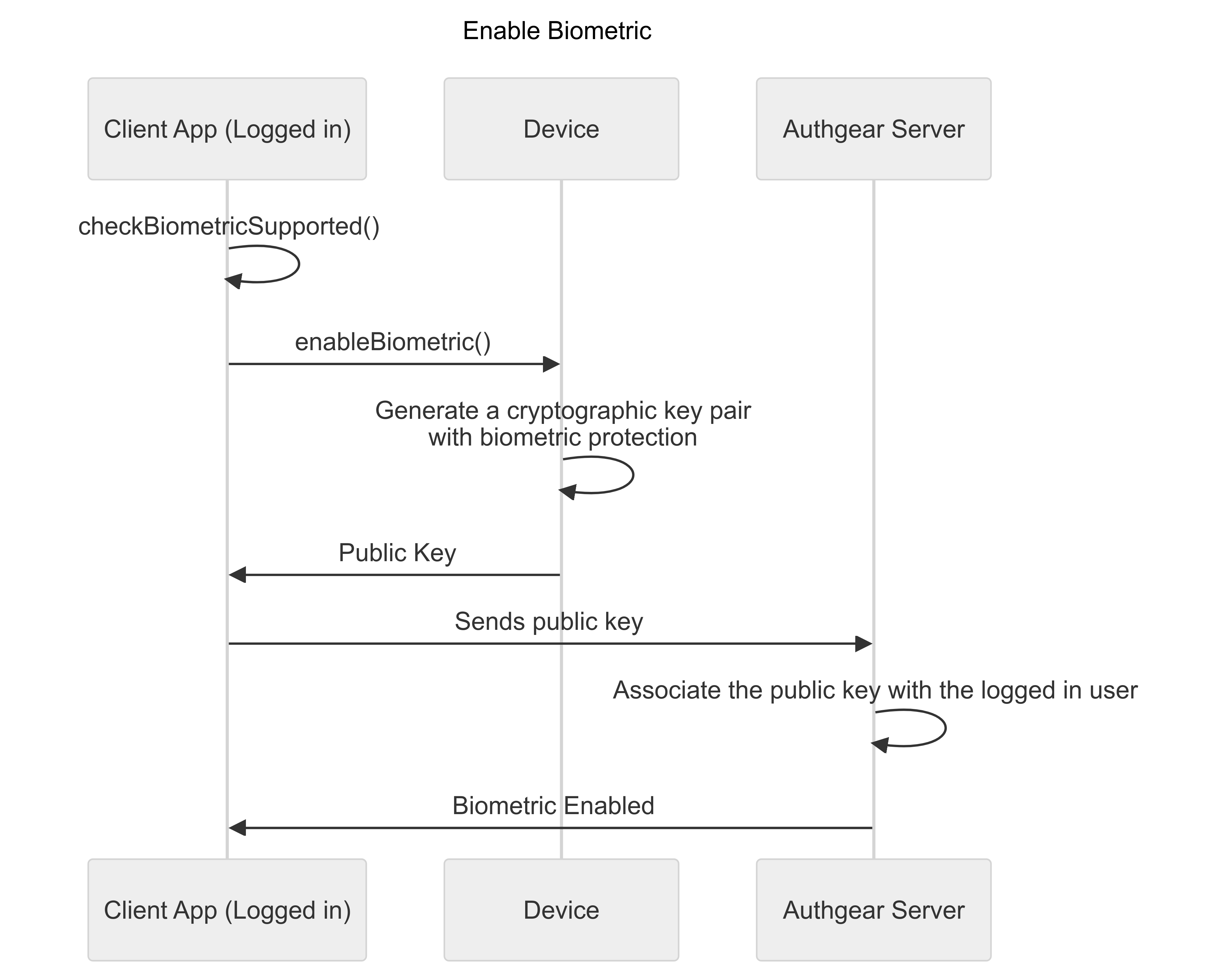 The Client App that is already logged in to a user's account will check if biometrics is supported by the user's device. If the device supports biometric login, it is then enabled. The public key is sent to Authgear server and associated with the logged-in user's account.