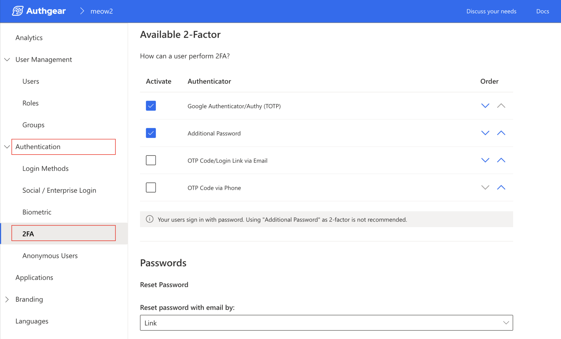 In Authgear, a password can be Primary or Secondary. Secondary passwords can be enabled as part of Two Factor Authentication (2FA).