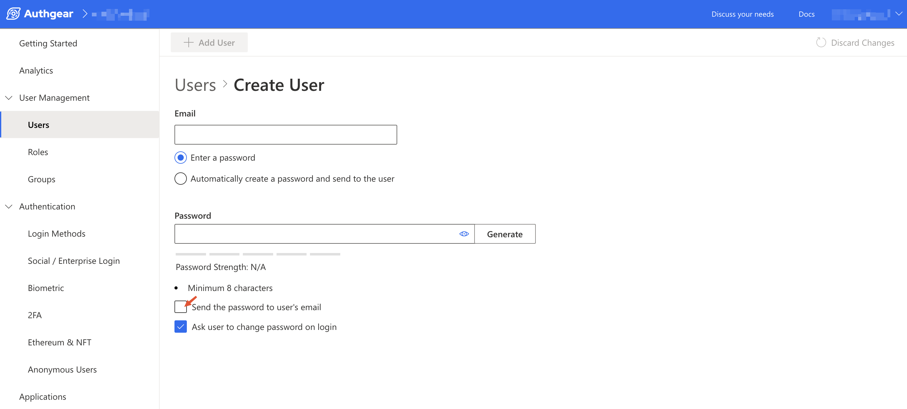 Check the "Send the password to user's email" box to enable Authgear to send the new password to the user.