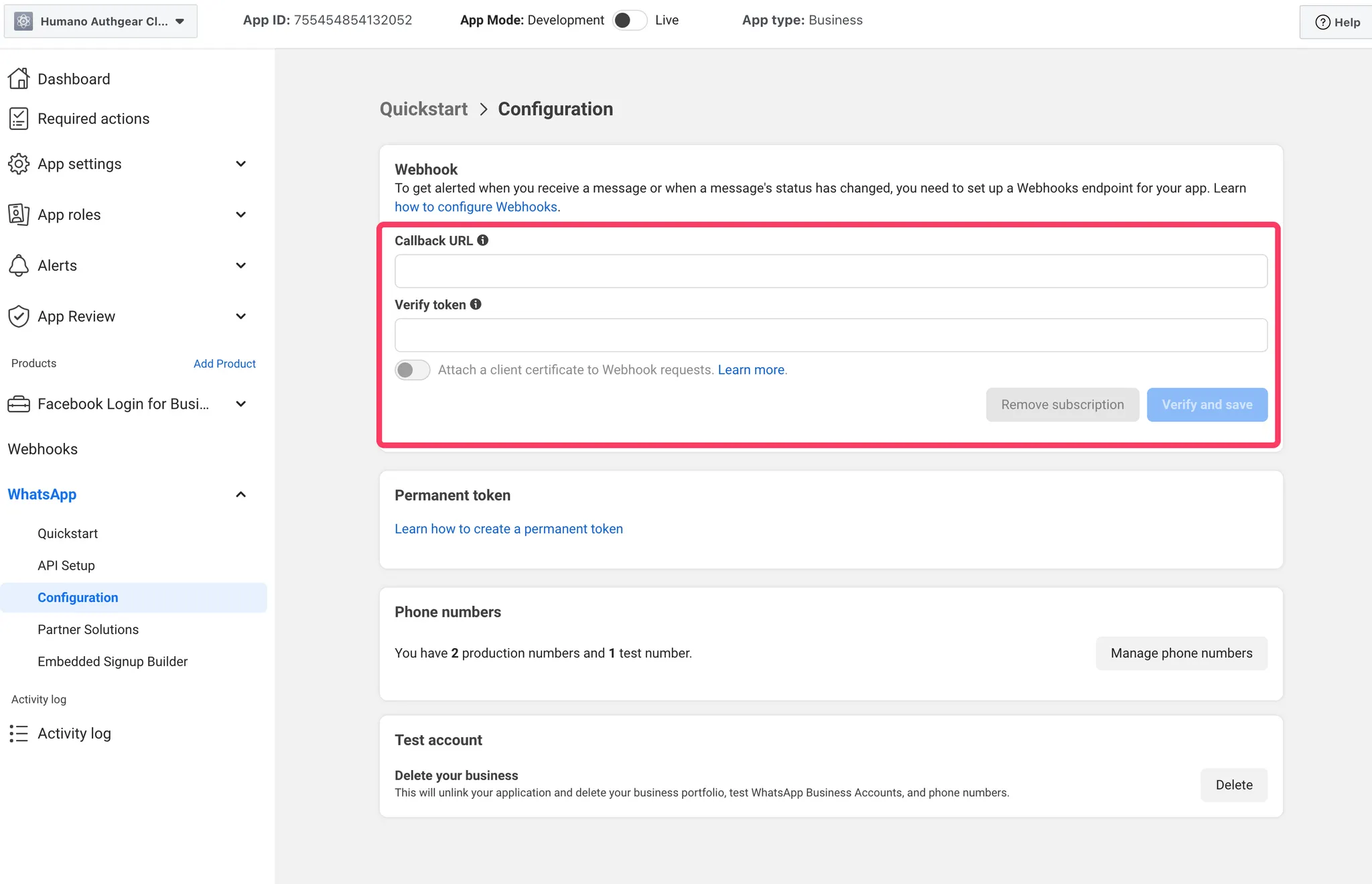 1. Callback URL: `https://{authgear_endpoint}/whatsapp/webhook`