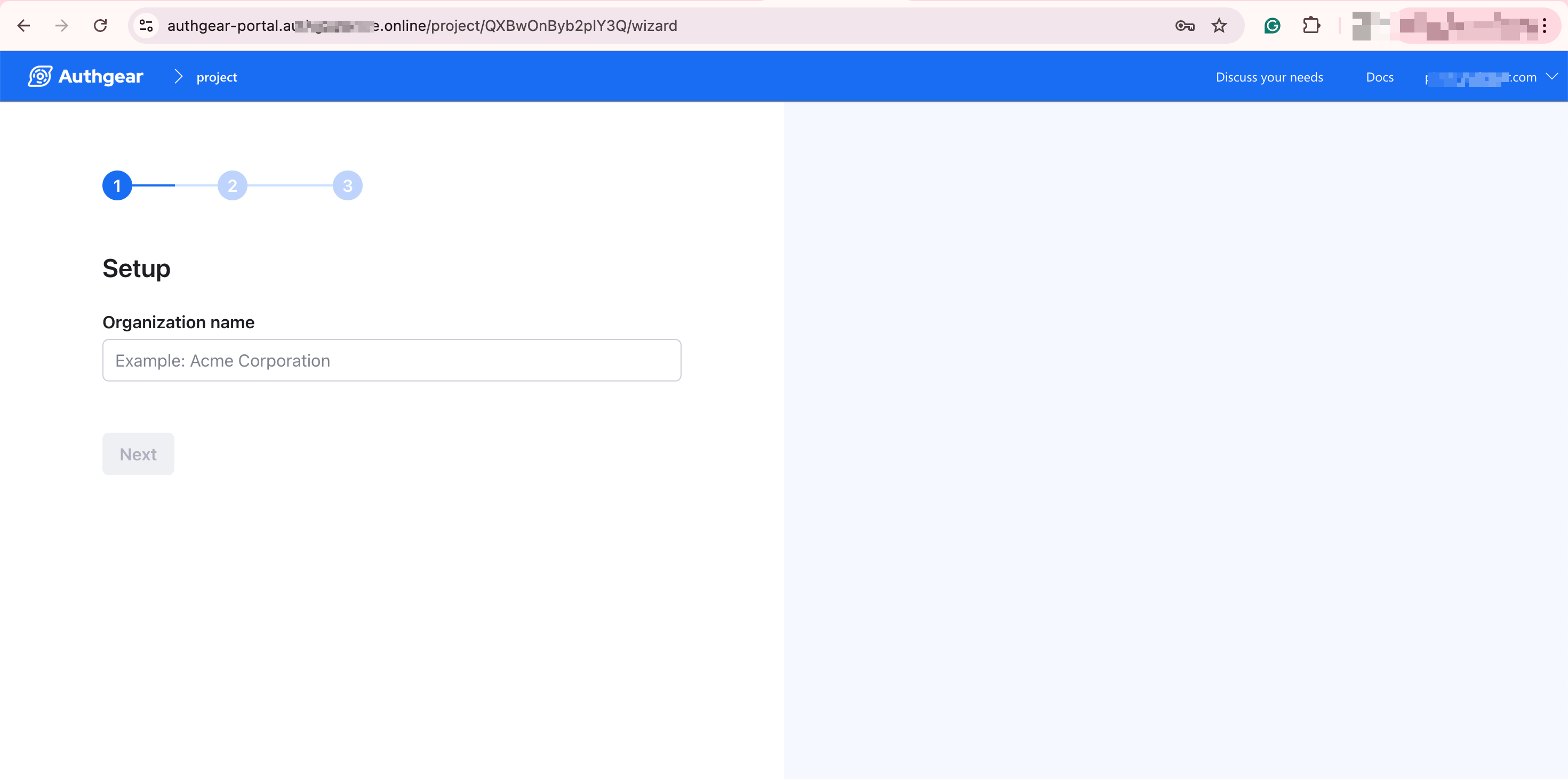 <figure><img src="https://2638622528-files.gitbook.io/~/files/v0/b/gitbook-x-prod.appspot.com/o/spaces%2F-MAjXpMovvVxeIY33s_K%2Fuploads%2Fgit-blob-4d4b1a896d73059df6694c564b4ee827ab5b1230%2Fonce-onboard.png?alt=media" alt=""><figcaption><p>onboarding screen in Authgear Portal</p></figcaption></figure>
