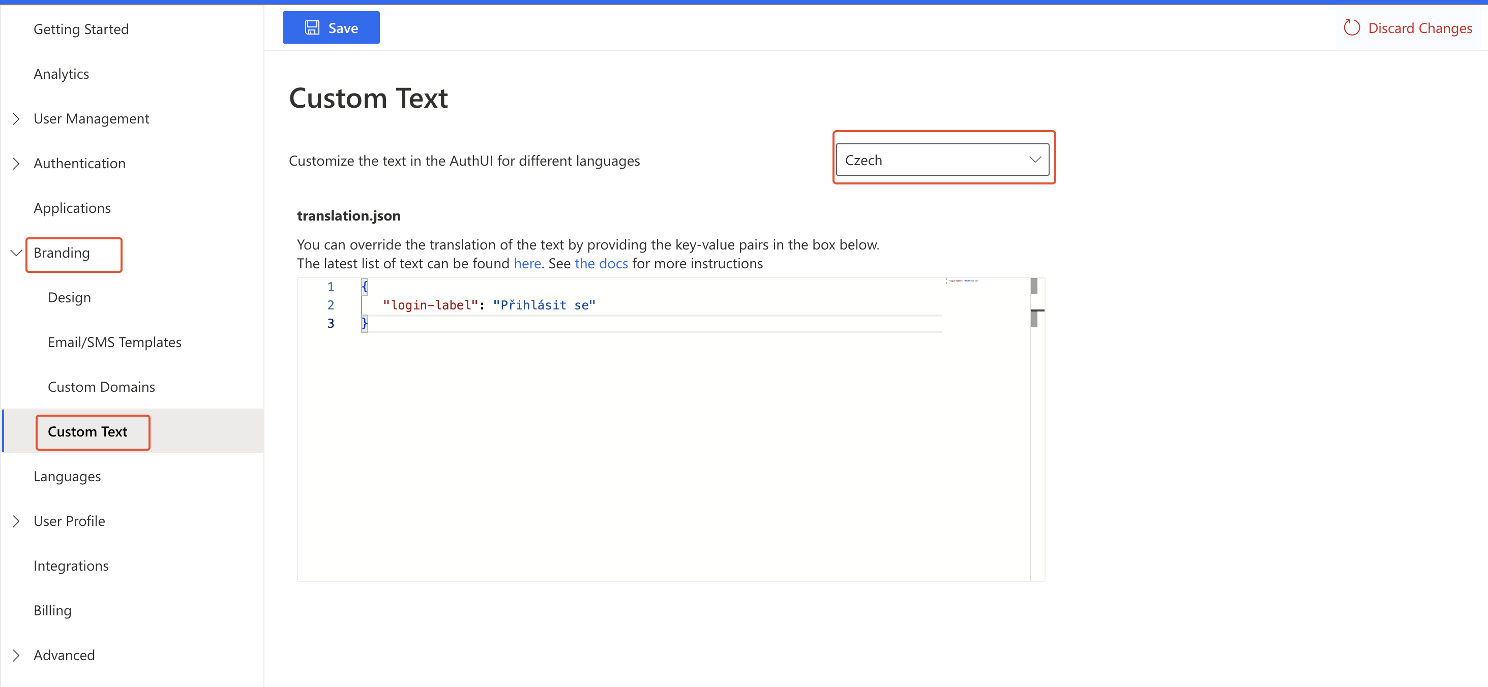 <figure><img src="https://2638622528-files.gitbook.io/~/files/v0/b/gitbook-x-prod.appspot.com/o/spaces%2F-MAjXpMovvVxeIY33s_K%2Fuploads%2Fgit-blob-4b575916b98f03b316bf7fd31665c9698ce9115a%2Fauthgear-custom-text-cz-example.png?alt=media" alt=""><figcaption></figcaption></figure>