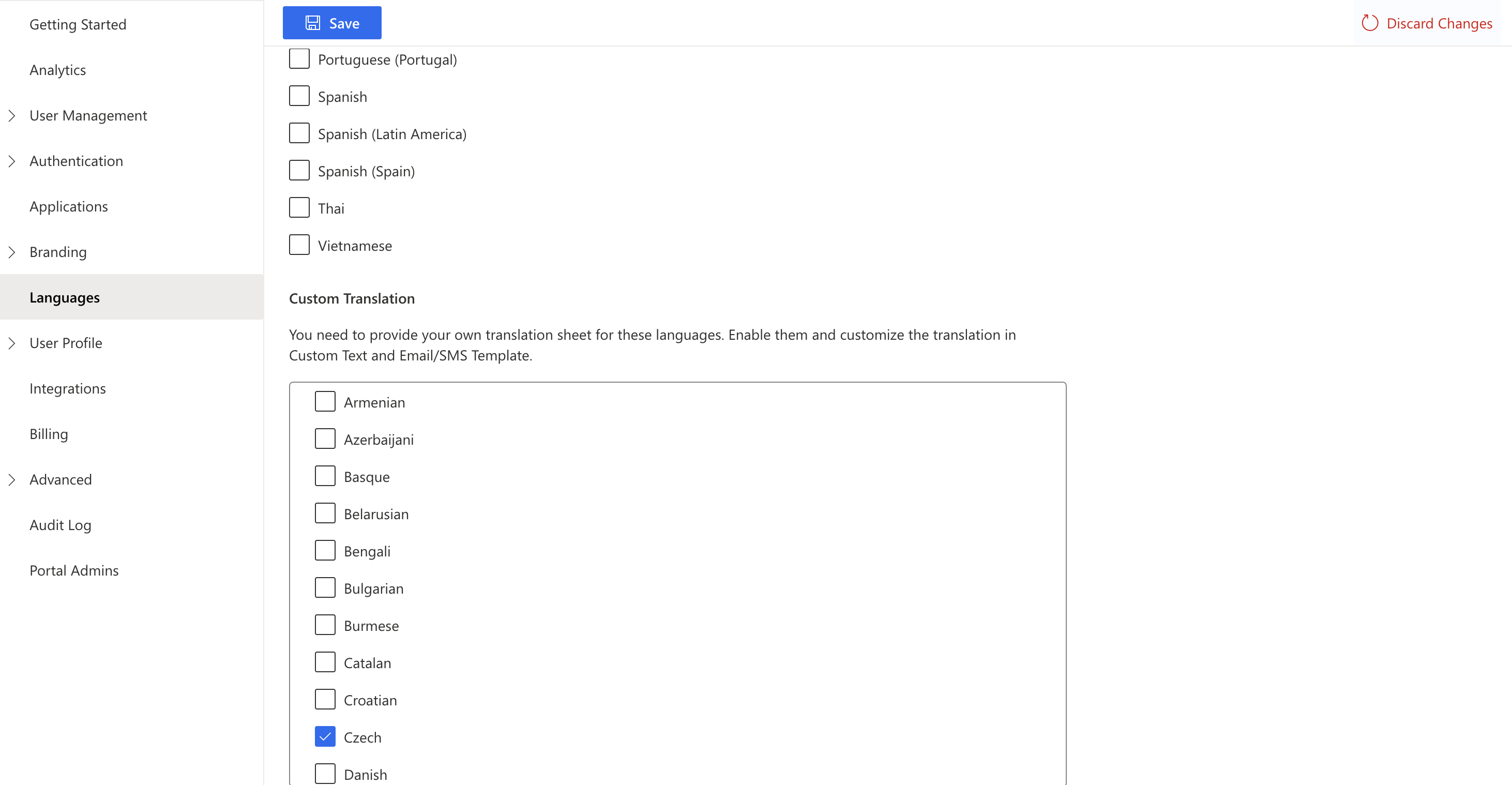 You can add more languages using custom translation.json. To do this, first enable the language from the **Custom Translation** subsection of Languages in the portal. For example, enable a language such as Czech, Danish, or Estonian from the custom translation subsection and then proceed to write the translation.