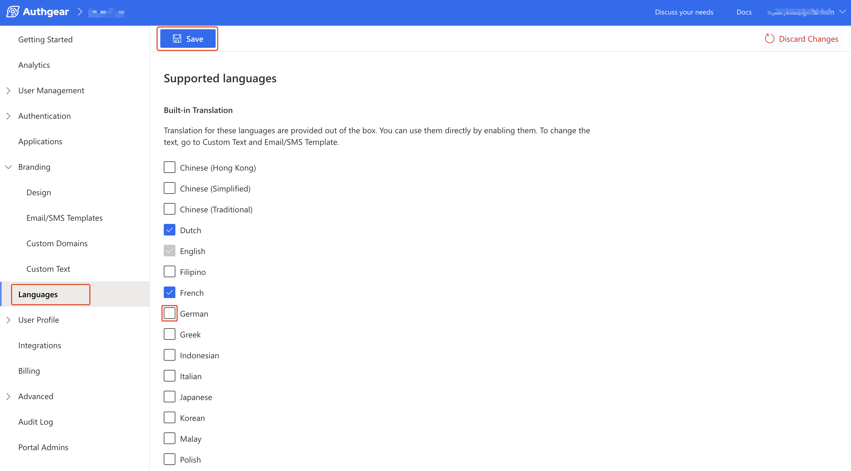 <figure><img src="https://2638622528-files.gitbook.io/~/files/v0/b/gitbook-x-prod.appspot.com/o/spaces%2F-MAjXpMovvVxeIY33s_K%2Fuploads%2Fgit-blob-8b6019b568d52c264c171610ea8566f7d8409171%2Fauthgear-custom-language-list.png?alt=media" alt=""><figcaption></figcaption></figure>