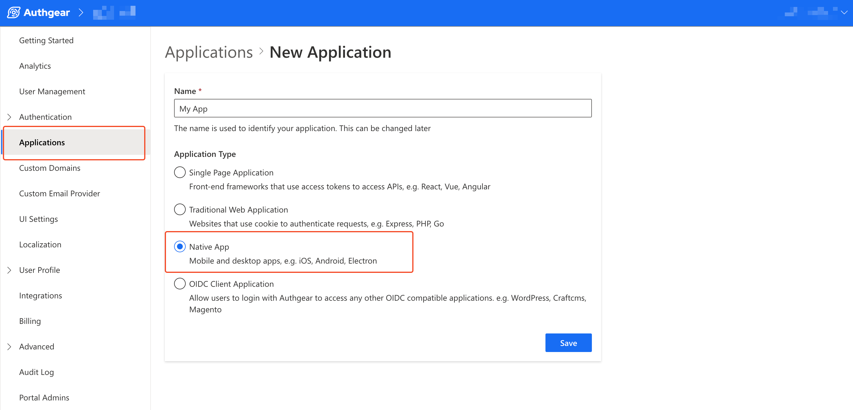 In your project, navigate to the **Applications** section then click on **Add Application** to create a new Authgear application. Enter a name for your application and select **Native App** as the Application Type. Next, click **Save** to continue to the configuration page for your new application. Skip the screen that shows you a list of tutorials for different frameworks.