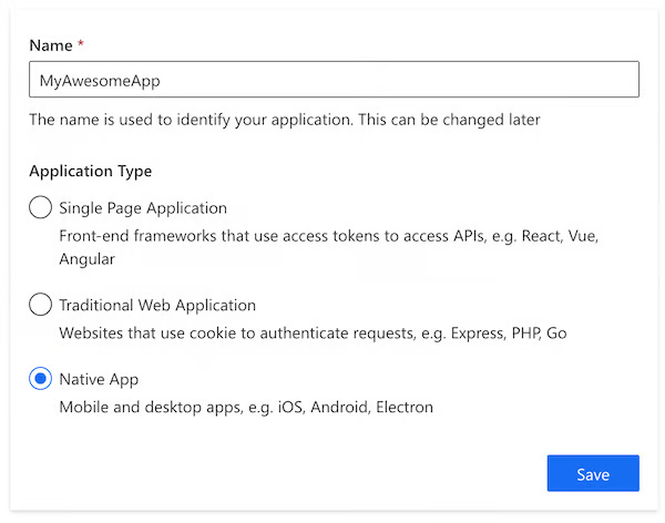 3. Input the name of your application and select **Native App** as the application type. Click "Save".