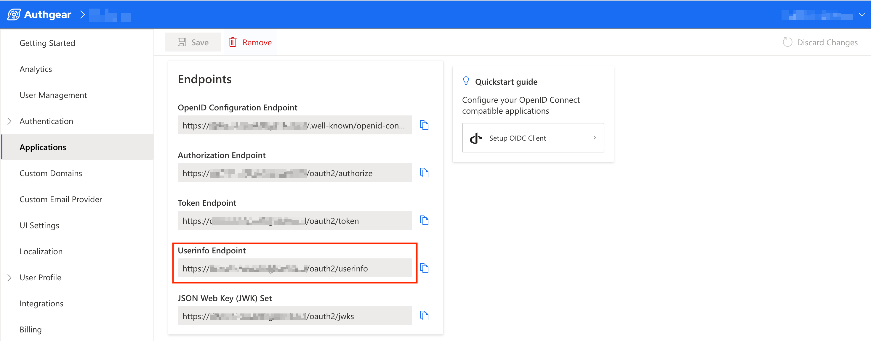 You can also find the full URL for the UserInfo endpoint for your Authgear OIDC Client Application under **Application** > **\[your application]** in Authgear Portal.
