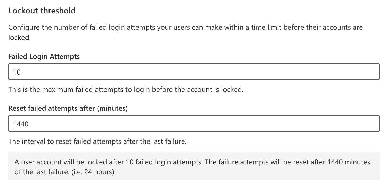 In this section, you can control after how many failed attempts the lockout will take effects, and the reset duration of the attempts. By default, the lock will be reset after 24 hours has passed from the last failed login attempt.