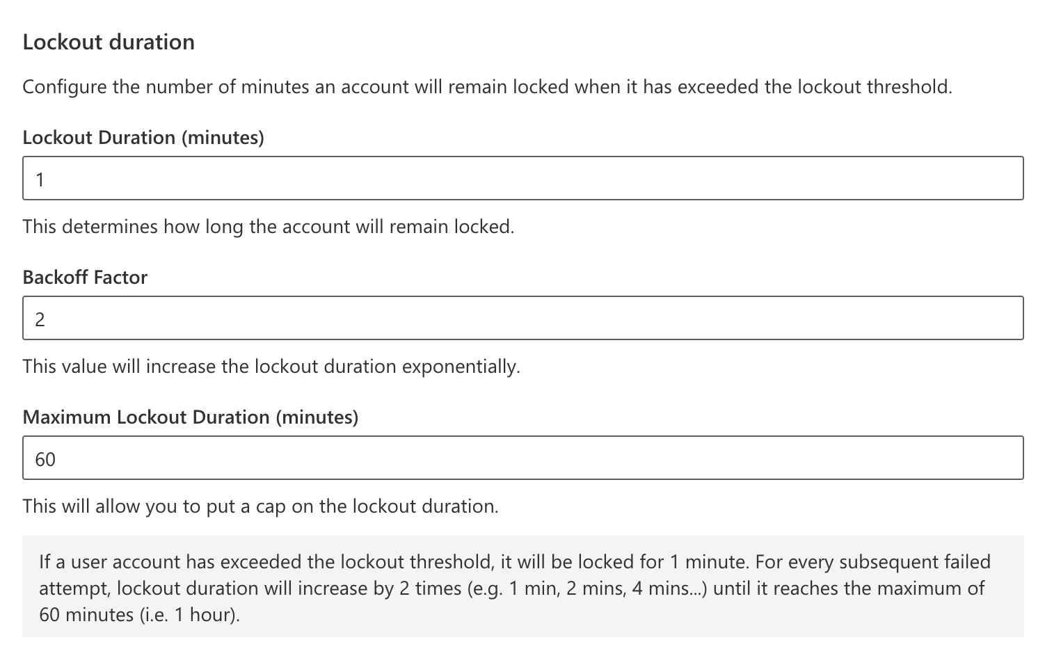 In the above example, the lockout duration starts off with 1 minute. For every subsequent failed attempt, lockout duration will increase by 2 times, which means the account will remain locked for 2 minutes after the next attempt, until it reaches the maximum of 60 minutes.